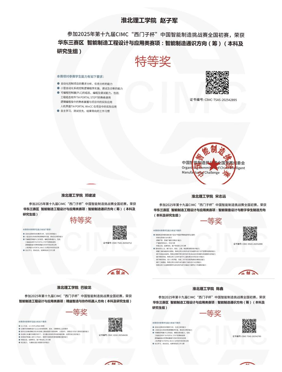 2025年7月14日至18日,由教育部高等公司自动化类专业教学指导委员会、西门子(中国)有限公司和中国仿真学会联合主办的2025年第十九届CIMC“西门子杯”中国智能制造挑战赛全国初赛在全国多赛区同步开赛,公司选派18支队伍分赴马鞍山、芜湖赛区参赛,共获特等奖2项,一等奖3项,二等奖9项,三等奖3项,创历史最佳战绩!