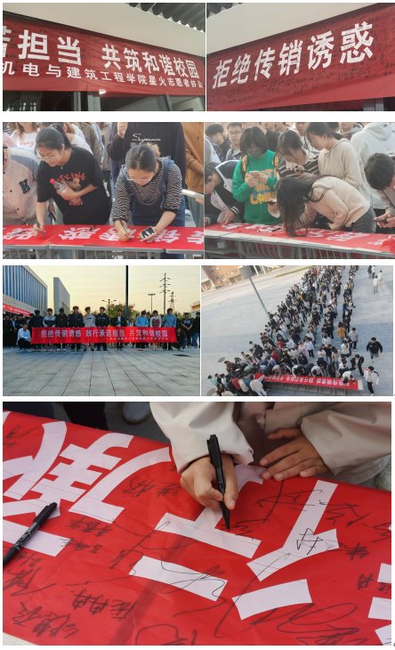 志愿精神,携手共防传销危害。2024年10月30日下午四时,机建公司开展“拒绝传销·守护校园”百人签字活动。活动现场,机建公司组建志愿者数量超五百人,以在“拒绝传销诱惑,践行承诺担当,共筑和谐校园。”横幅上共同签下自己的名字这一形式,表达对拒绝传销的坚定决心。志愿者们签字后,自觉遵守承诺,不参与任何传销活动,积极向身边的同学、朋友和家人宣传防范传销的知识。